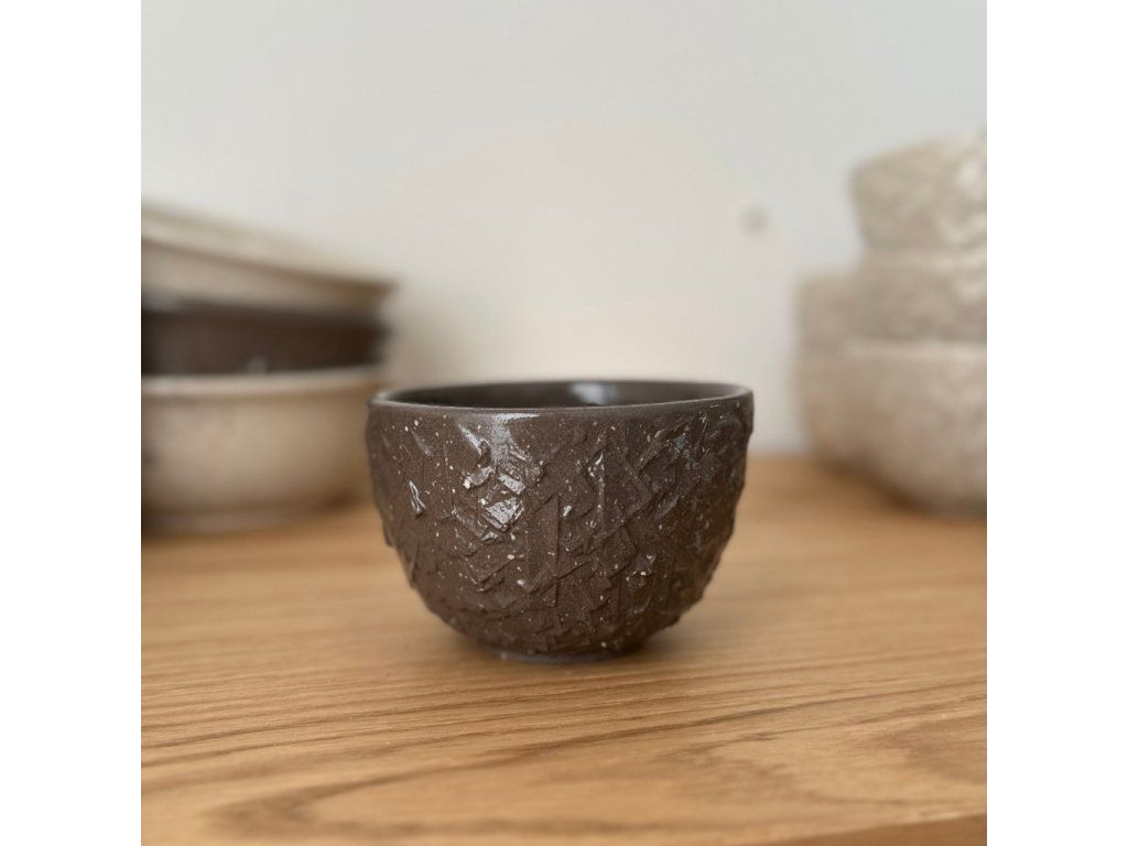 Reliéfní ručně dělaný povrch s průhlednou glazurou a jemnými stříkanci na tmavé hlíně.