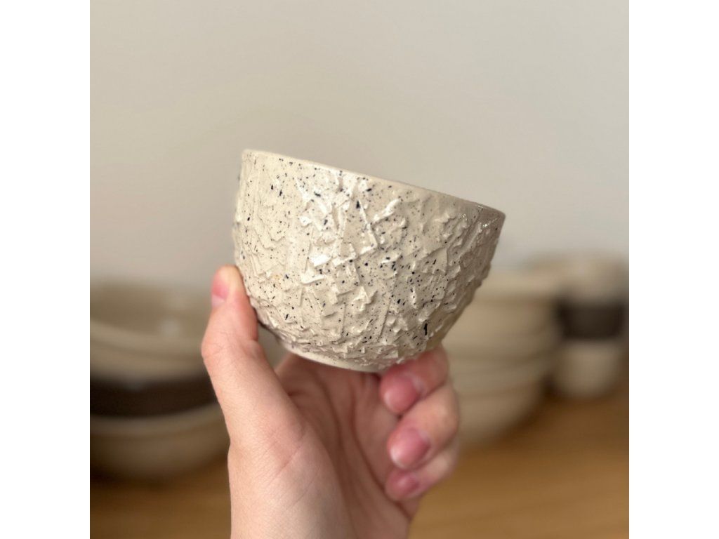 Reliéfní ručně dělaný povrch s průhlednou glazurou a jemnými stříkanci na světlé hlíně.